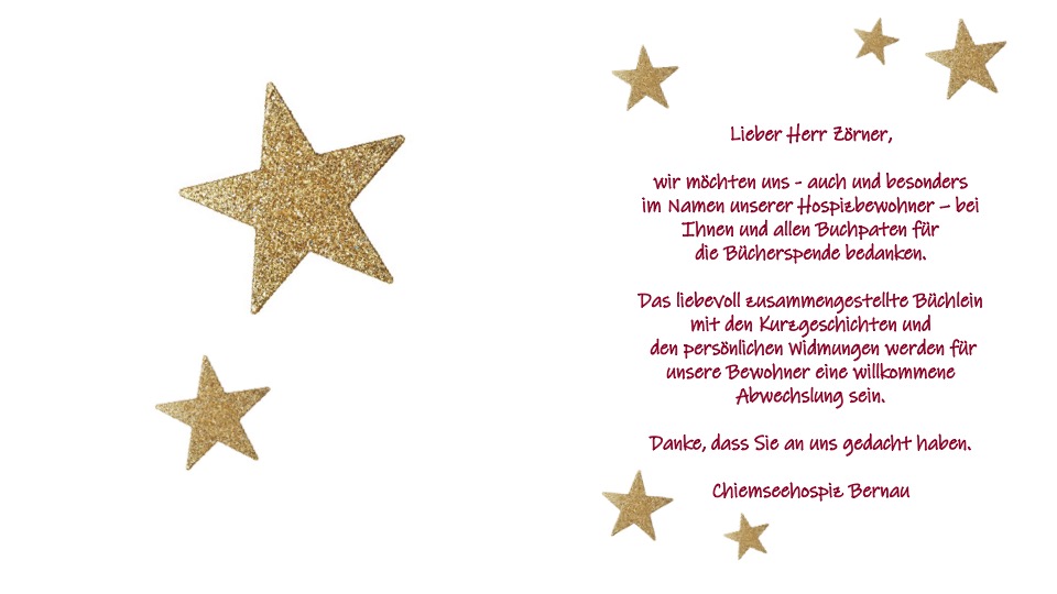 Gemeinsam mit Paten habe ich die Aktion Bücher für Hospize gestartet. In Zeiten von Corona hatte ich das bereits 2020 für Altenheime mit großem Erfolg gemacht. Die Paten die bisher dabei sind, sehe Sie hier, die Liste wird ergänzt.